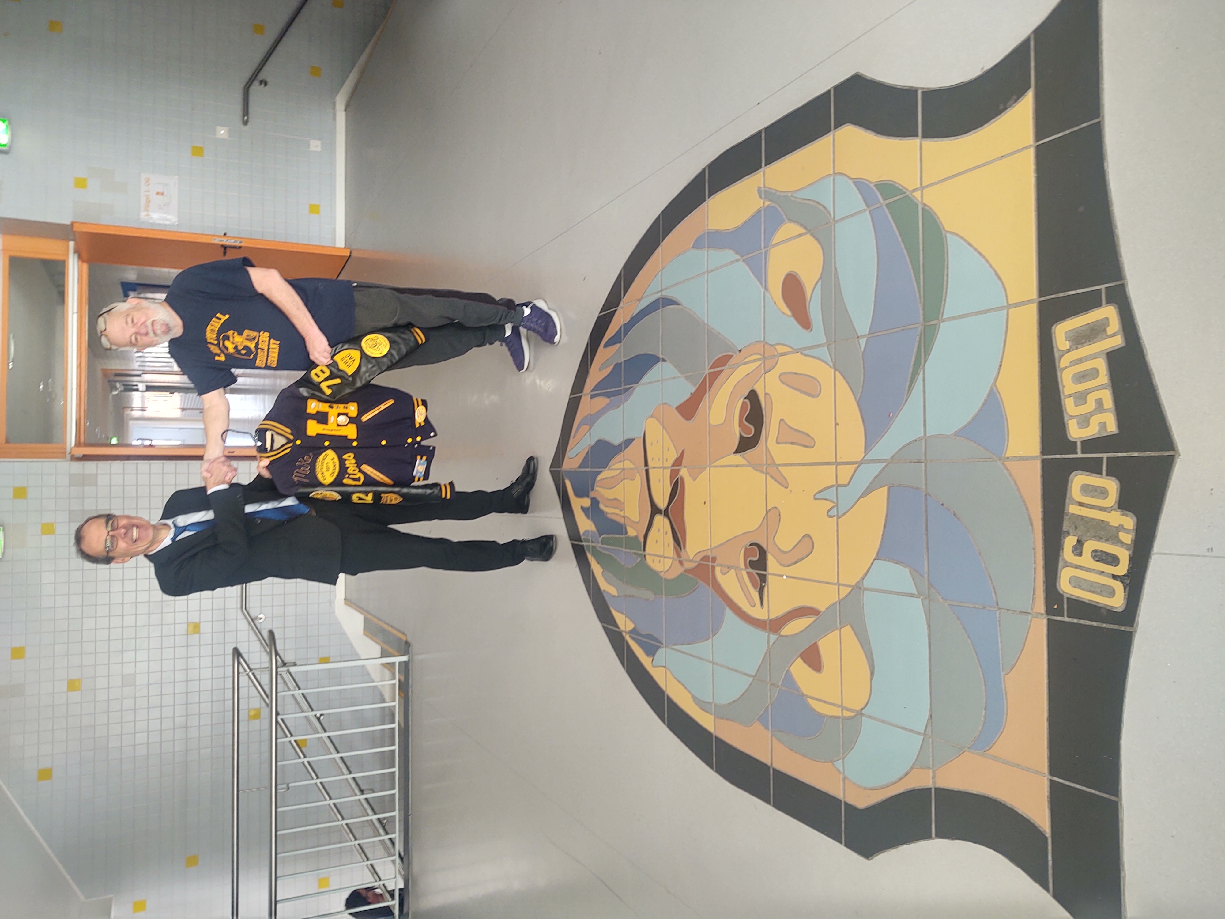 Als Geschenk übergab er Schulleiter Uli Richard Liebler seine Jacke aus der High School-Zeit, die von den Erfolgen der damaligen Sportteams der amerikanischen Schule, den Heidelberg Lions, kündet. Zusammen mit anderen Erinnerungsstücken soll sie in unserem Gebäude an die Zeit von 1946 bis 2013 erinnern, als die Kinder der amerikanischen Militärangehörigen hier ihren High School-Abschluss erwarben.