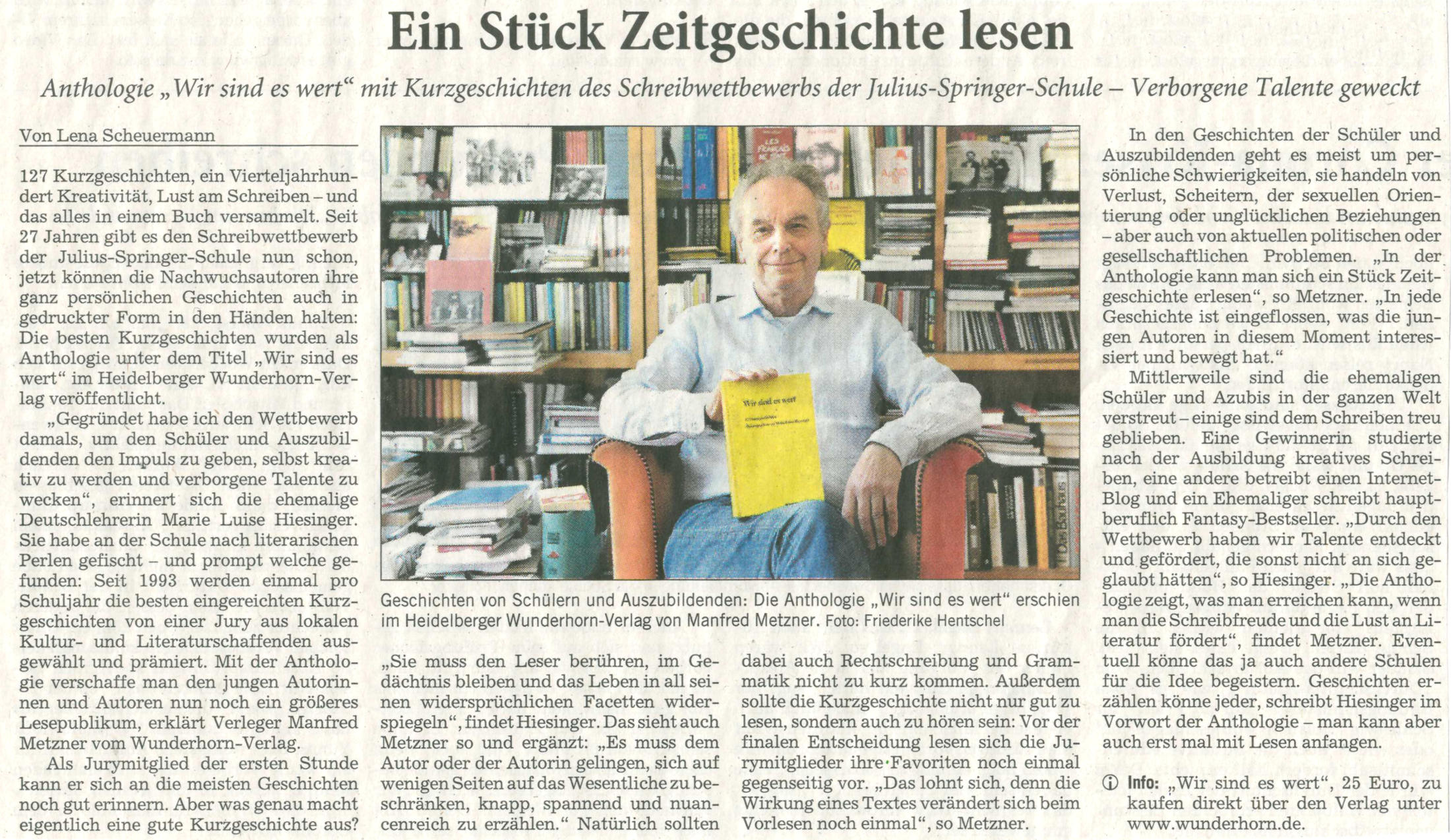 Am 10. Mai 2017 fand zum 25. Mal die Preisverleihung zum Erzählwettbewerb der Julius-Springer-Schule statt. Die Rhein-Neckar-Zeitung nahm dies zum Anlass, einen Bericht über die Initiatorin, unsere ehemalige Abteilungsleiterin Molli Hiesinger, zu schreiben. Den Bericht finden Sie hier.
