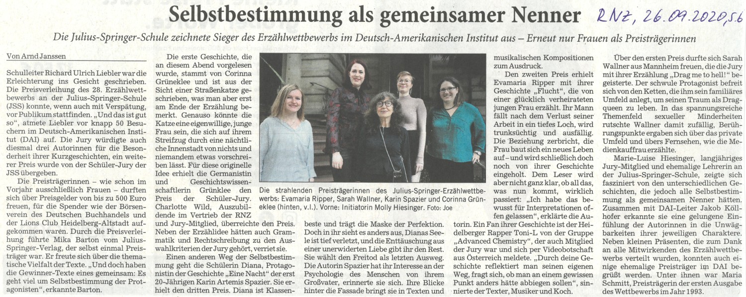 Am Mittwoch, den 27.10.2021 findet um 14:30 Uhr im DAI (Deutsch Amerikanischen Institut) Heidelberg die 29. Preisverleihung des Erzählwettbewerbs an der Julius-Springer-Schule statt. Die PreisträgerInnen werden vorgestellt, sind im Gespräch mit den Juroren und lesen aus ihren Texten. Milena Ehrmann, eine ehemalige Schülerin der Schule, die in London Musik und Gesang studiert hat, wird für uns singen. Es wäre sehr schön, wenn viele SchülerInnen an dieser Veranstaltung teilnehmen würden.
